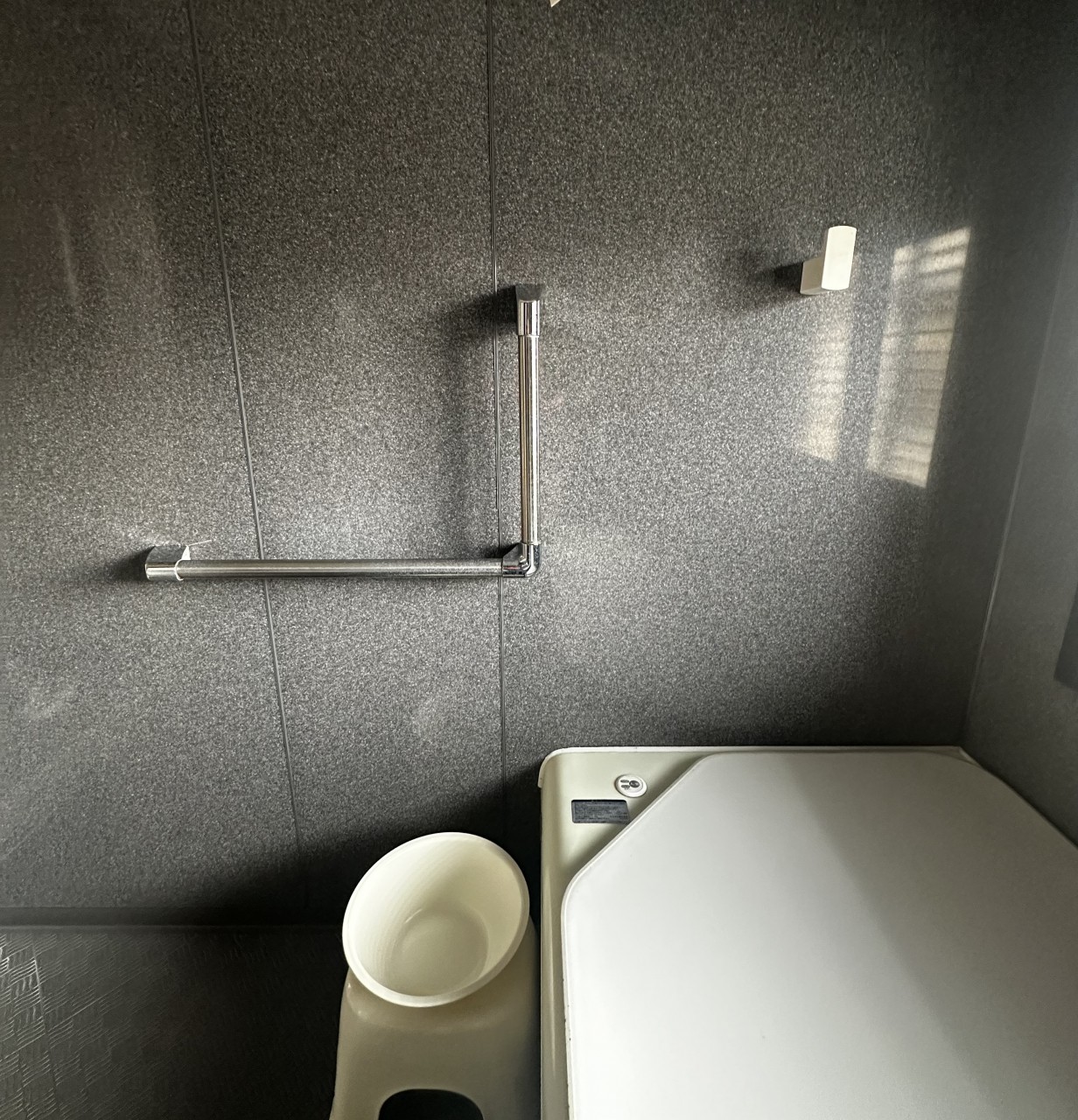 いつもは浴槽から出るときのことを一番に考え浴槽の奥の位置か浴槽内に手すりをつけることが多いけれど、浴槽に入るための浴槽手前の壁につく手すりも大事だと実感。自宅浴槽の手すりは普段タオル掛けとして使うだけでしたが今回浴槽へ出入りをするためにとてもお世話になっています。