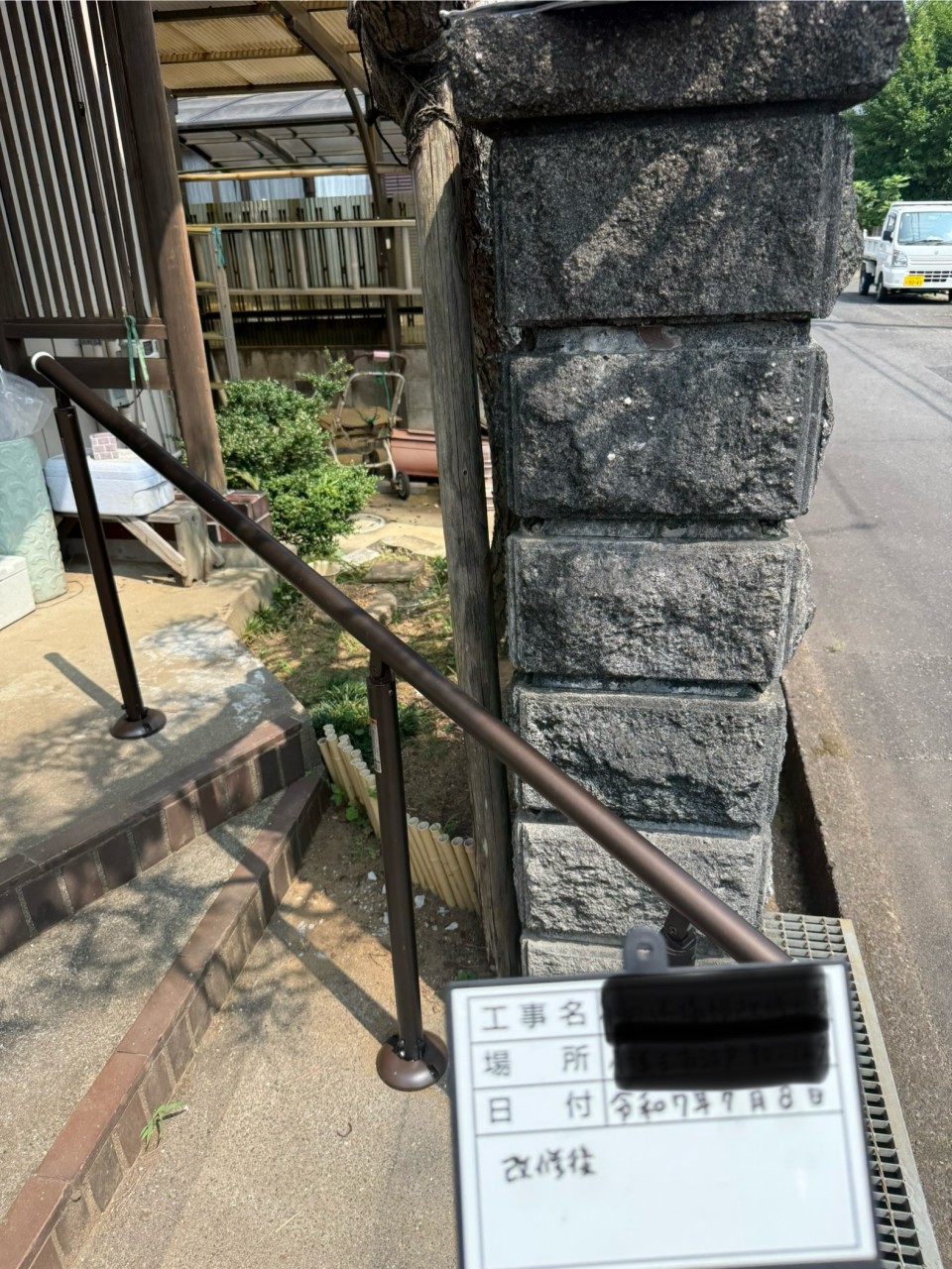 今回の工事は道路から玄関までのアプローチに段差があるため手すりを設置する工事でした。