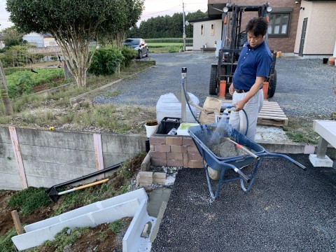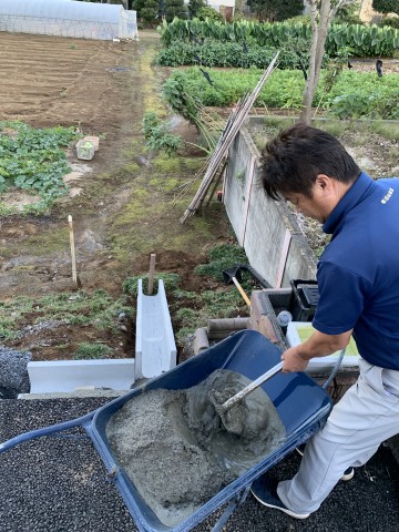 今日の文男氏は、事務所の庭に側溝を設置していました。