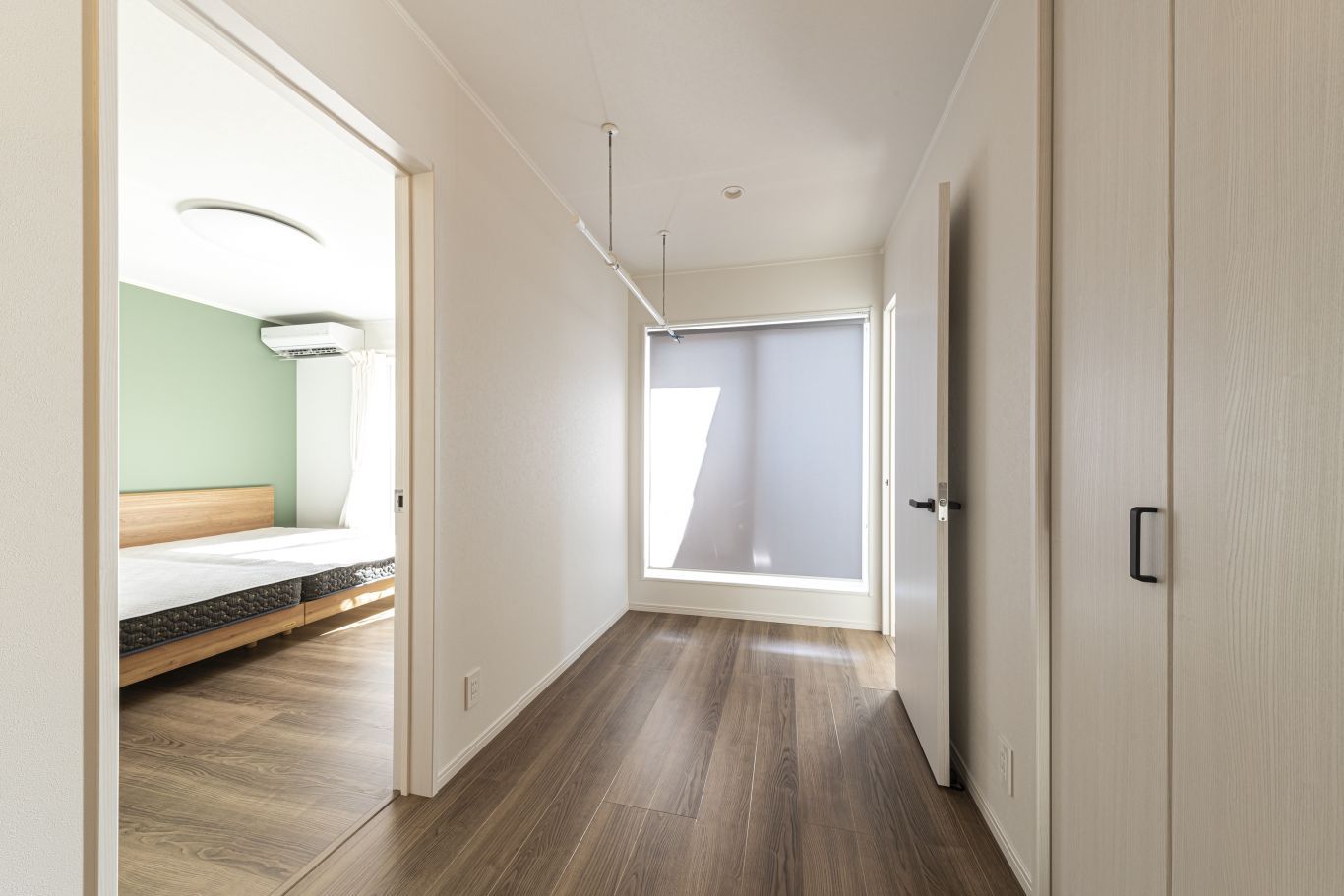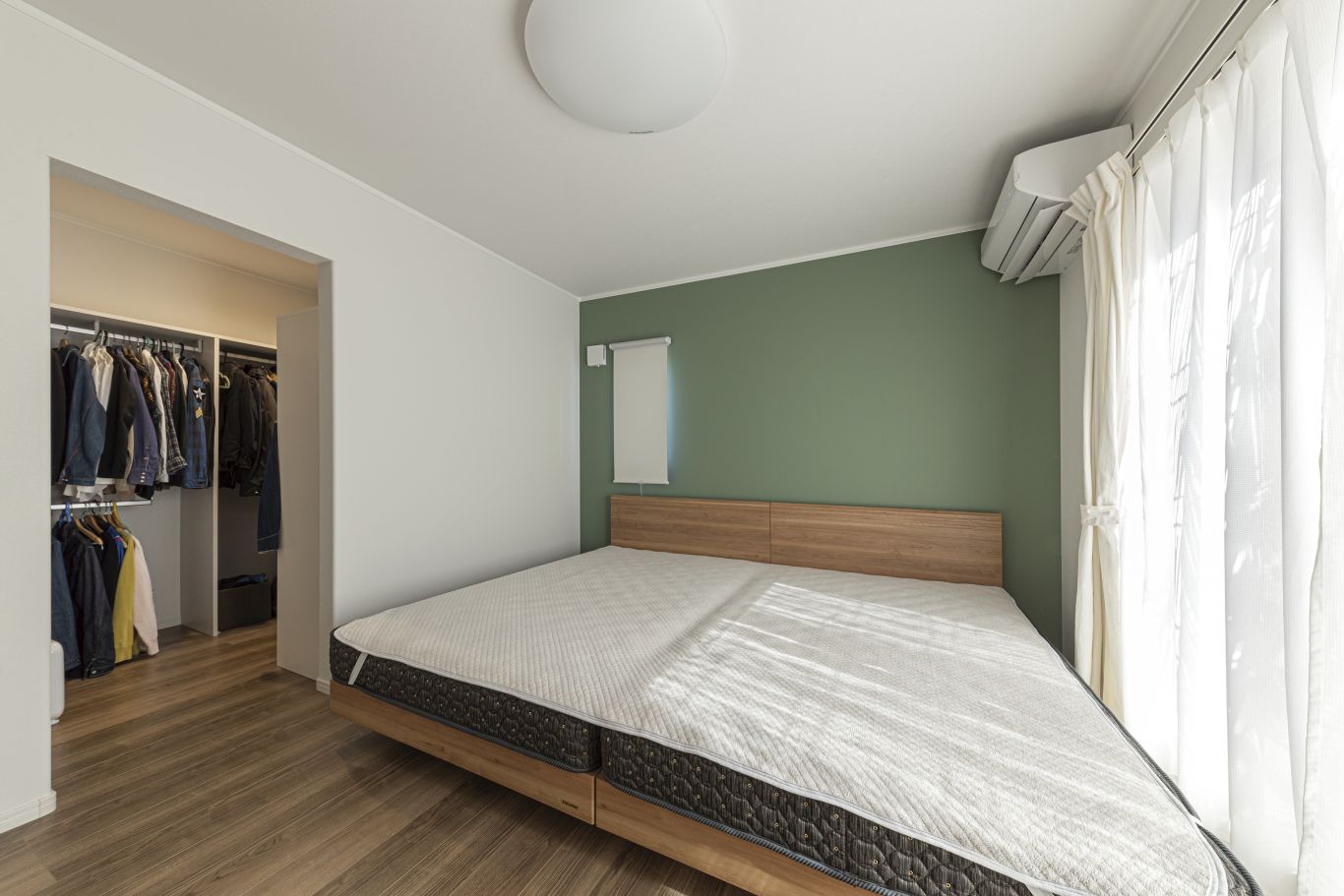 ウォークインクローゼットを備えた寝室。アクセントクロスのグリーンがおしゃれ