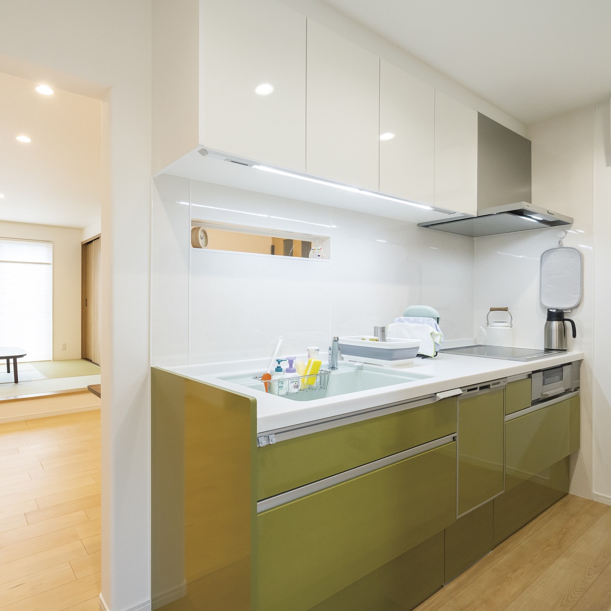 キッチンからは小窓で家族を見守ることができる