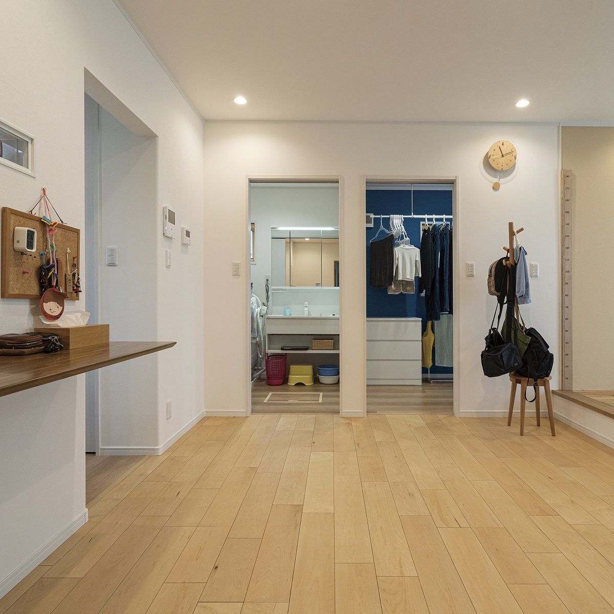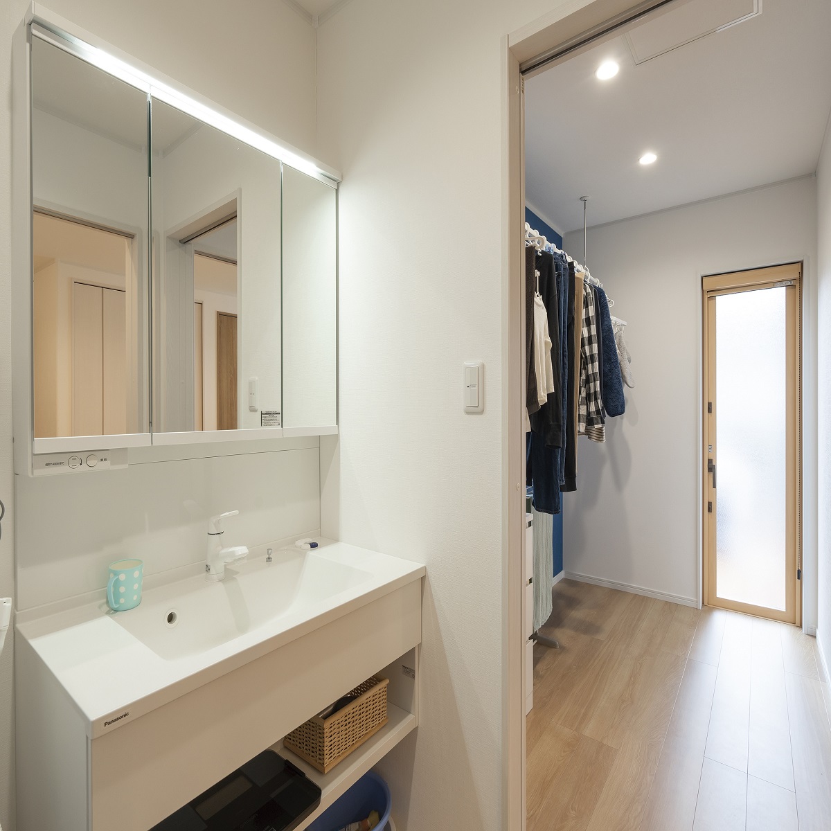 リビングから繋がる洗面脱衣室・ランドリー。それぞれの部屋同士も行き来ができるので家事がしやすい