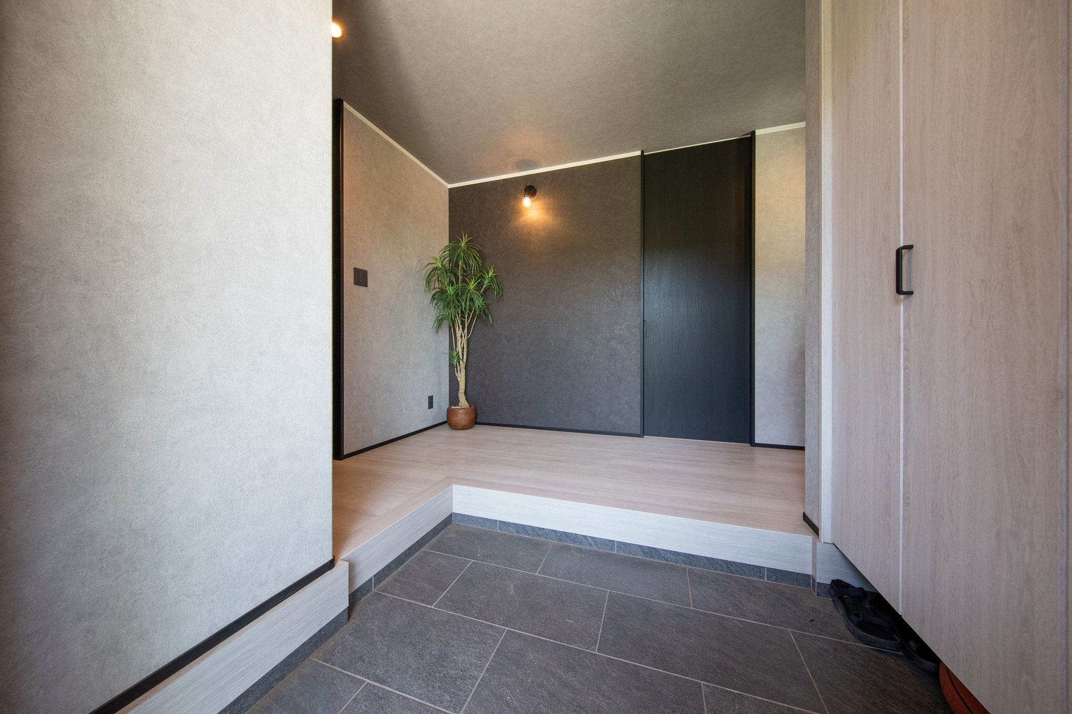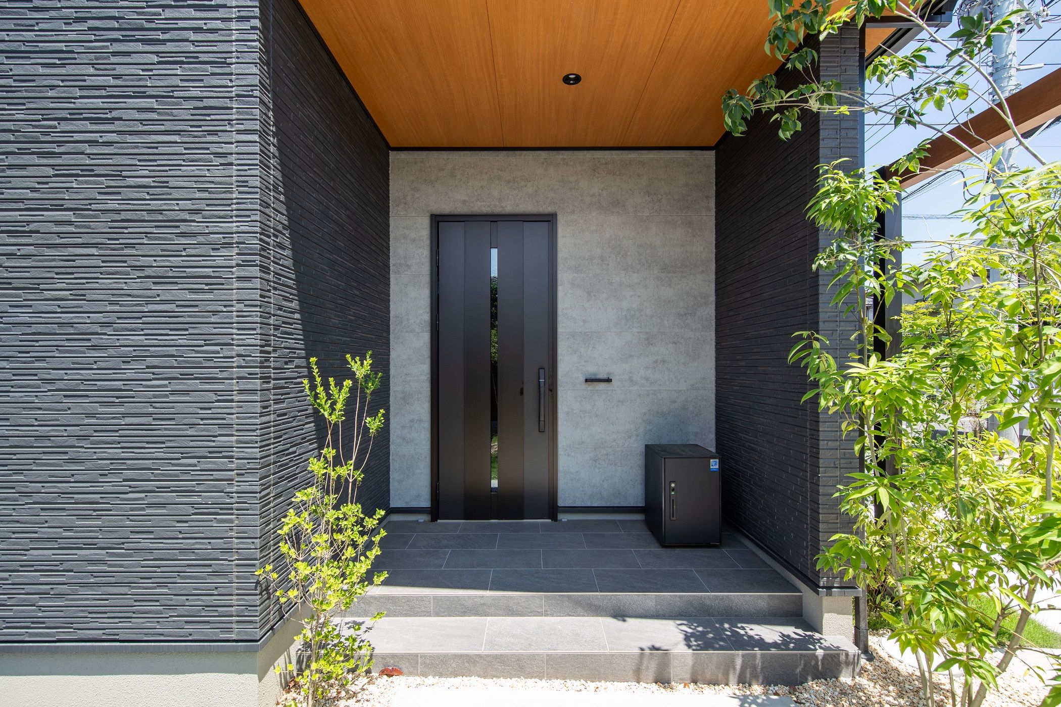 玄関周りはアクセントカラーの外壁。サッシをより引き立たせます