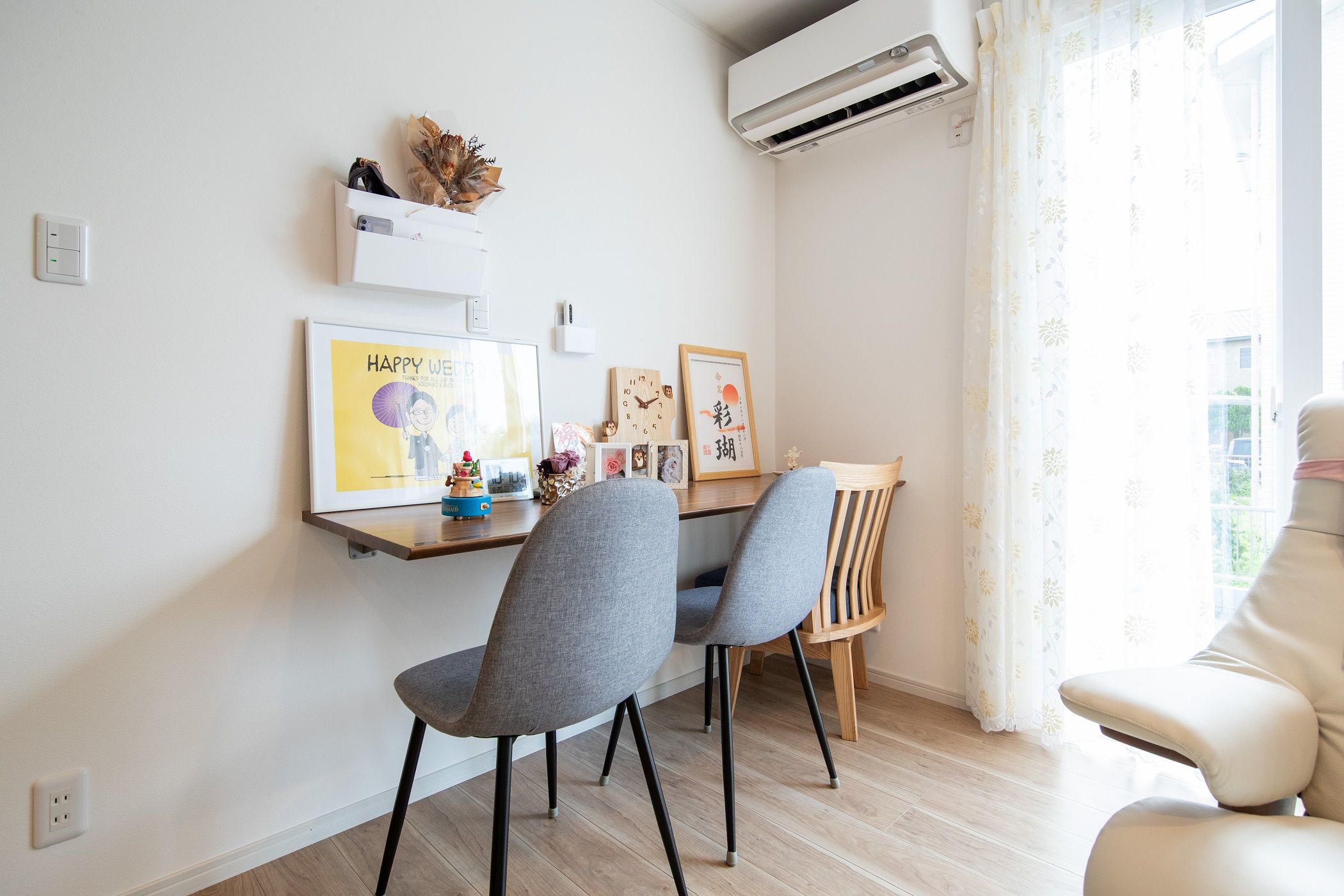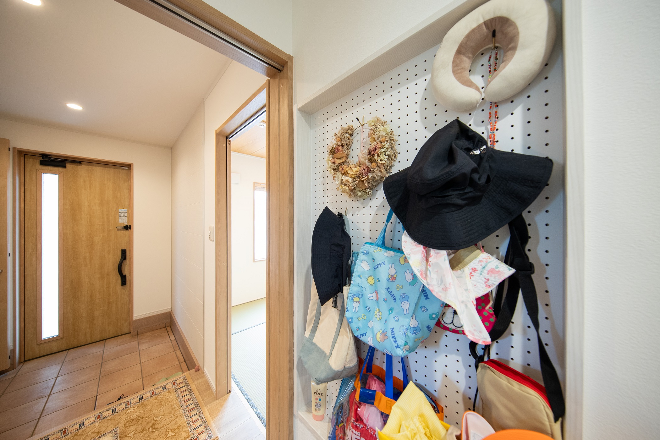 入口の有孔ボードにはいろいろなものをかけられます