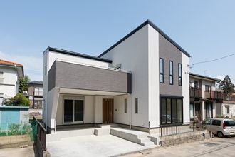 ソーラーパネル搭載の省エネ住宅。スッキリとした印象のモダンなデザインです。