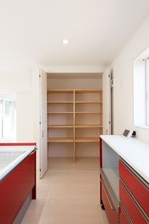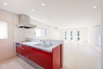 白を基調とした室内に映える真っ赤なキッチン。キッチンからは開放感たっぷりなリビング&ダイニングが一望できます。