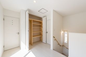 生活の基点となる2階ホール。ホールからはLDK・脱衣洗面所・お風呂にいけるので、ホール収納をぐるりと回る動線で、家事が完結します。